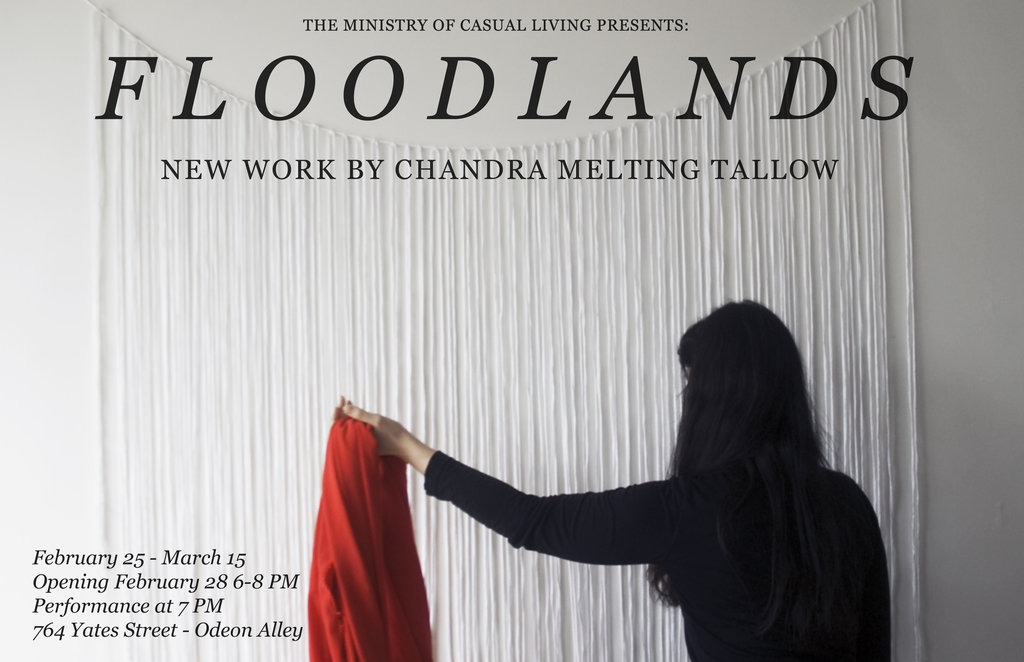Using textiles, pigments and found objects, accelerating and guiding the influence of gravity, Floodlands reflects the artist's experience moving through and overcoming historical trauma. This is demonstrated within the context of a greater social movement of mass healing, as exemplified by Idle No More. Immersing the viewer in negative space, this work seeks to reconcile the experience of bearing witness to the continual struggle of loved ones affected by colonization. It suggests a flowing motion toward reconciliation and creative mending invoking the raw, real evidence of trauma, while embracing the momentum of history. The artist's work explores hard new directions of the personal process of decolonization in the midst of social awakening and celebration.