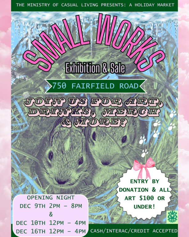 SMALL WORKS Sat. December 9th 2023 @ The Ministry of Casual Living By Donation (All Ages) 2:00 - 8:00 Other Dates / Times Dec. 10, 2023 2:00 doors at 12:00 Dec. 16, 2023 2:00 doors at 12:00